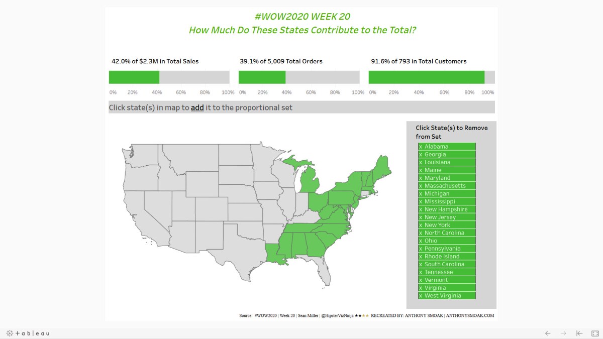 Sean Miller (@HipsterVizNinja) created a dashboard that enables the user to select a US state, which then adds that state to a set. Three proportional bar charts update at the top of the viz. A right side bar area displays all of the selected states and selecting a state will remove the state from the set, side bar and the map.